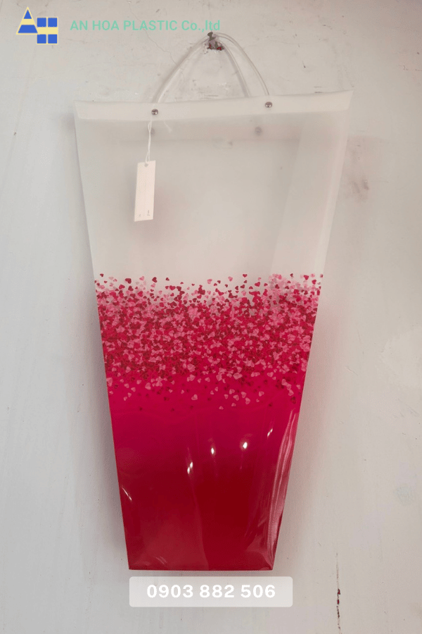 Chiếc túi sở hữu thiết kế hình nón ngược độc đáo, phần thân trong suốt chuyển màu gradient từ trắng sữa sang hồng phấn rồi đỏ rực rỡ ở đáy túi. Hàng nghìn chấm tròn li ti được in chìm nổi như những cánh hoa rơi nhẹ, tạo hiệu ứng thị giác lung linh, sang trọng mà vẫn rất lãng mạn. Chỉ cần nhìn thoáng qua, bất kỳ ai cũng nhận ra ngay: đây không phải túi đựng hoa thông thường, đây là một món phụ kiện thời trang dành cho chính bó hoa của bạn.